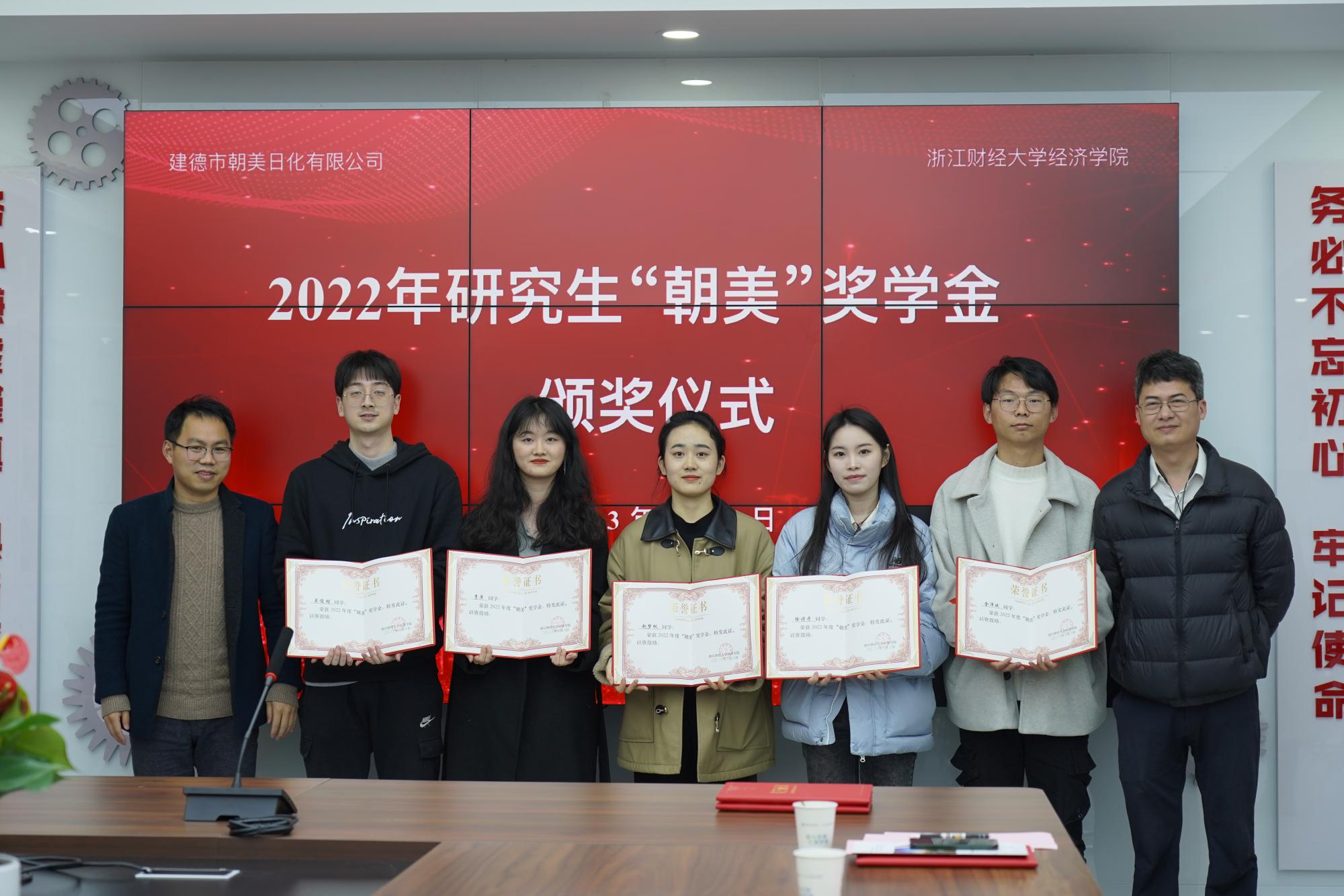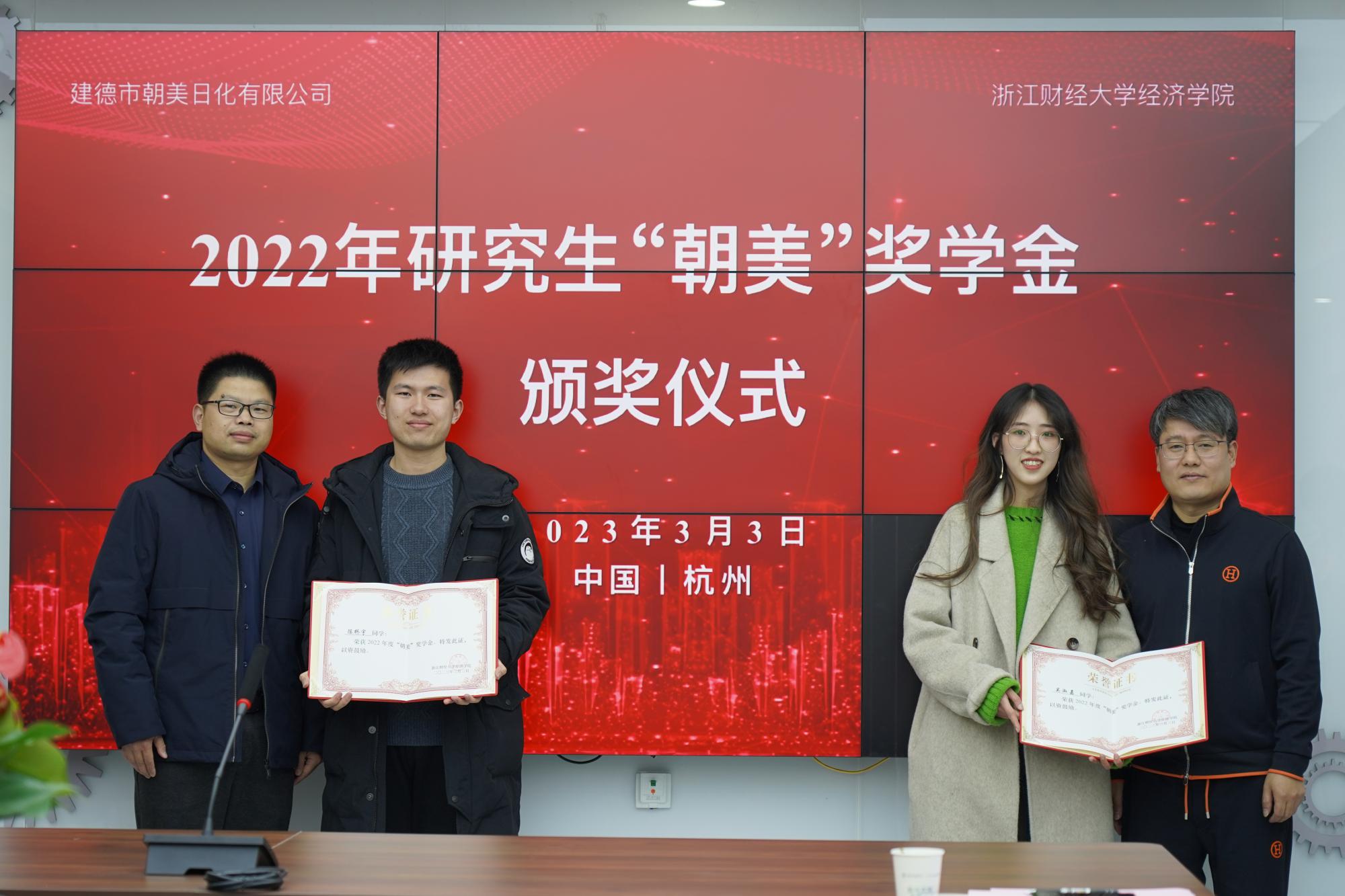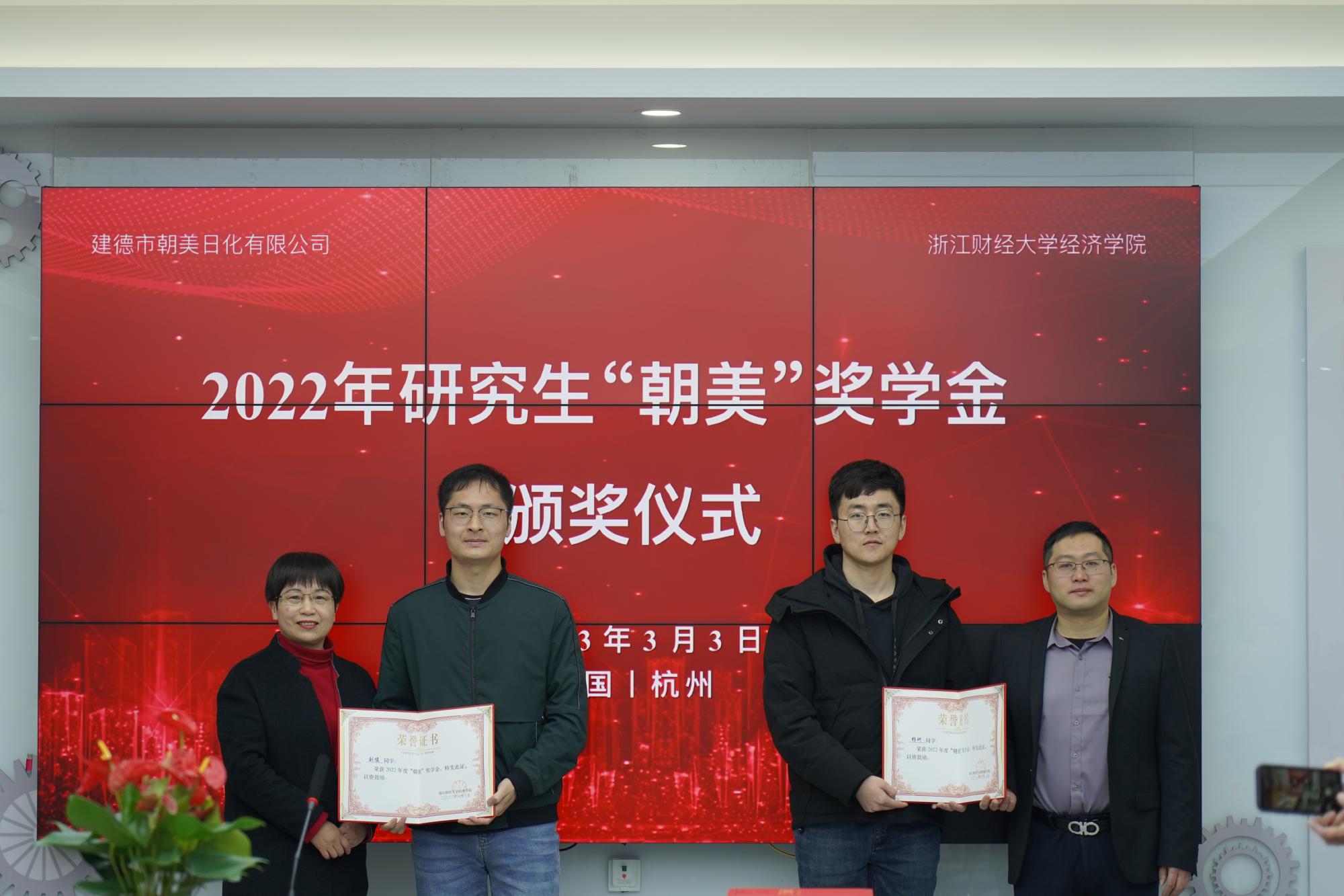 3月3日下午,首届研究生“朝美”奖学金颁奖仪式在建德市朝美日化有限公司举行。公司总经理、平博·(pinnacle)中国官方网站研究生社会导师林焰伟,公司副总经理、平博·(pinnacle)中国官方网站创业导师朱利平、胡庆辉,以及平博·(pinnacle)中国官方网站党委书记胡亦琴,副院长罗俊,党委副书记崔泰铭,副院长邓晓军等出席仪式并为获奖学生颁奖。活动由党委副书记崔泰铭主持。