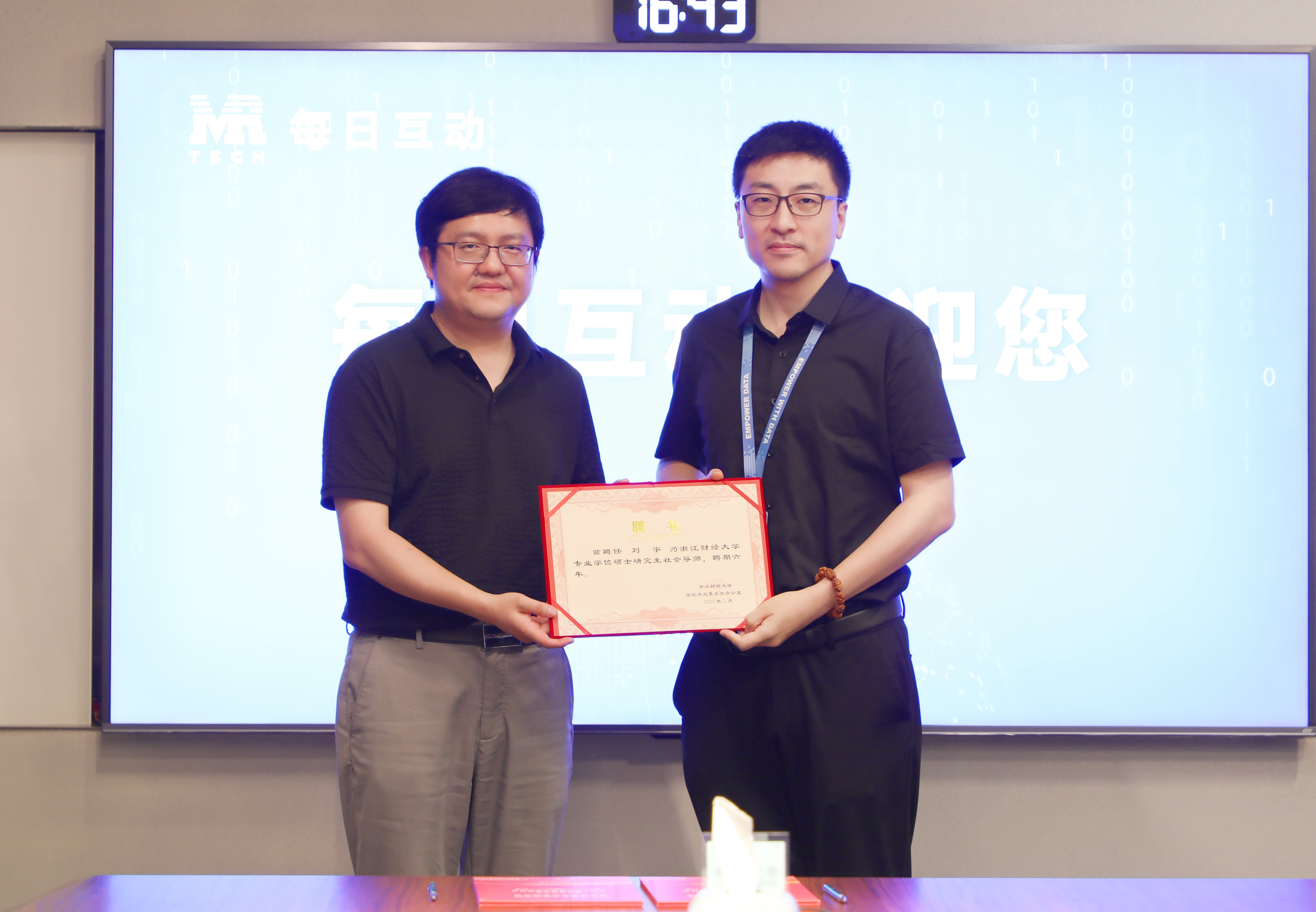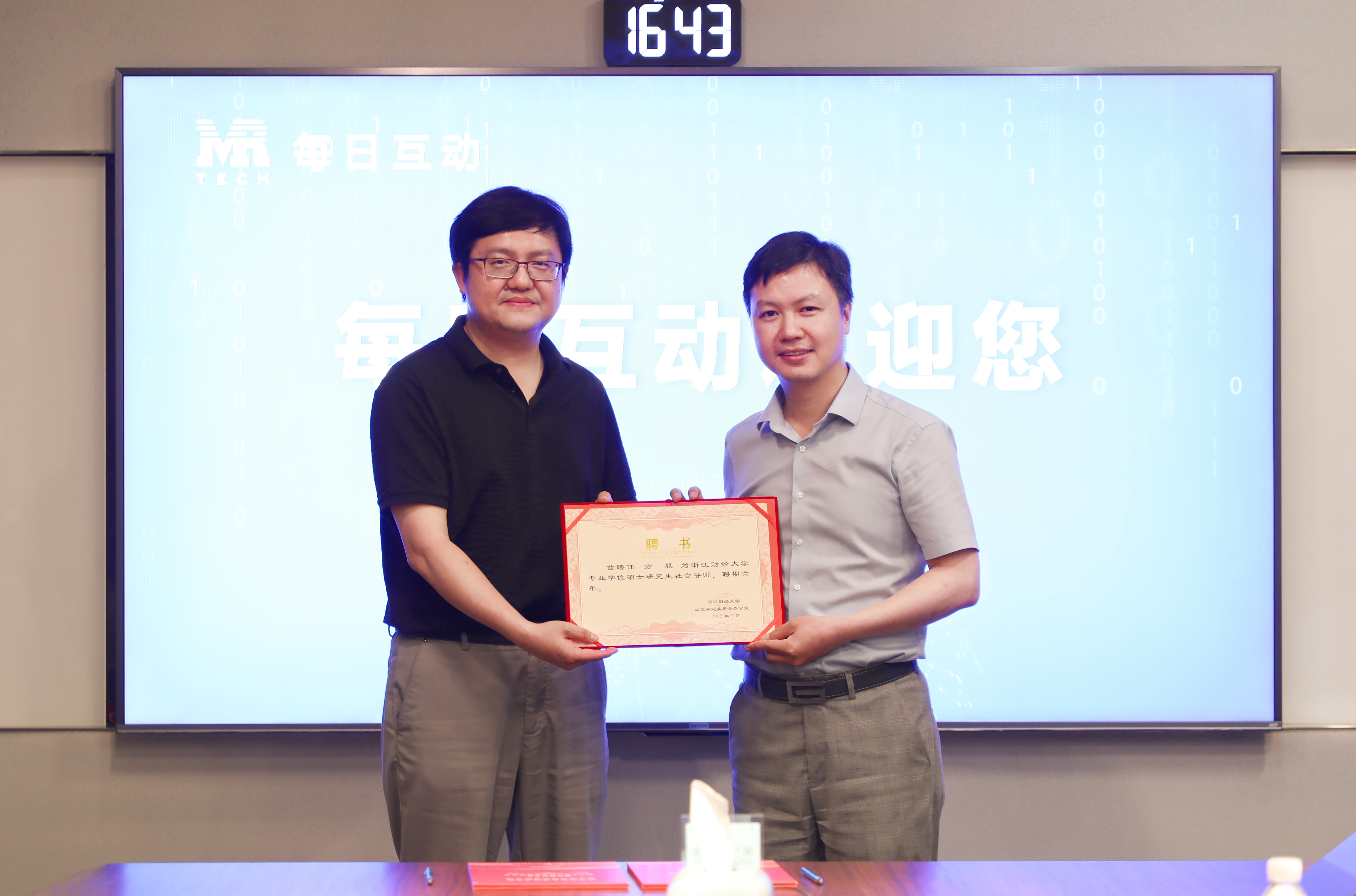 在签约环节,王岭与刘宇代表双方完成签约。随后,双方举行了浙江财经大学-每日互动“人工智能+”专业学位研究生联合培养基地授牌仪式。之后,徐奇伟书记为方毅董事长、刘宇总裁颁发浙江财经大学数字经济专业硕士研究生社会导师聘书。