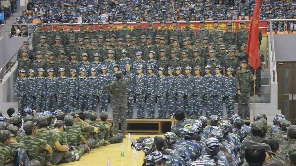 比赛中,各营代表队形整齐、着装统一、上下场井然有序,璀璨的灯光映衬着他们的军装,整个体育馆成了一片绿色的海洋。舞台上,新生们挺直的身姿、执着的眼神、嘹亮的歌声,彰显着青春不羁的骄傲与自信。