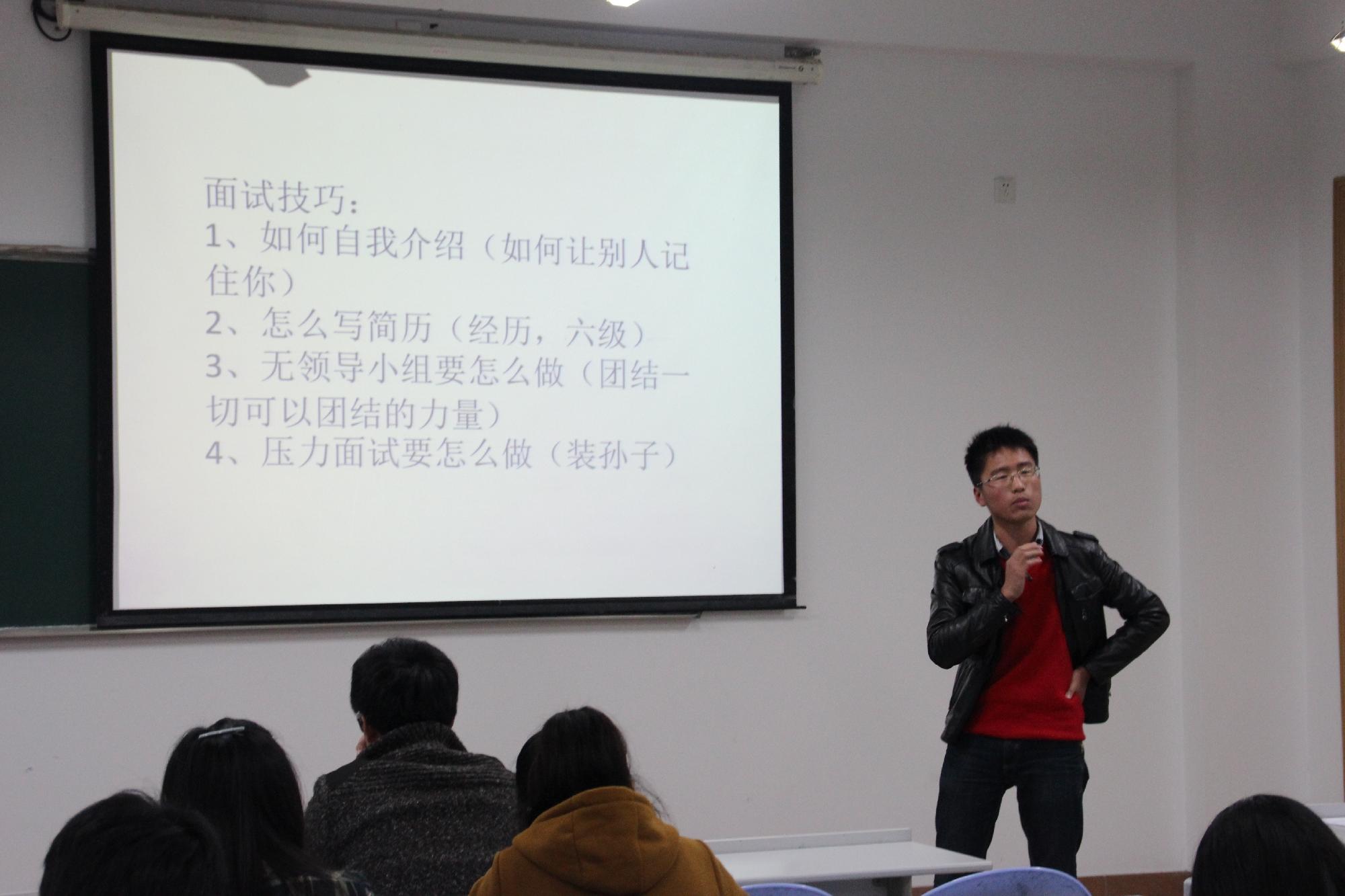 学长从四个方面分享了他的经验,一是从社会实践中得到能力的锻炼,二是他的面试经验,如何使自己变得更优秀,让简历与面试不再是难事。期间,有不少同学也积极地参与进来,分享了自己的面试过程,学长认真倾听着,时不时地点头赞同。三是讲述了他创办的学与用教学资源网,而这个网站的成功创建远远离不开他曾经那些看似无关紧要的社会实践活动,“正是因为我曾经实践过,努力过,失败过,我才会拥有这次成功的基石。”而第四点对于同学们而言十分实用,刘瑜学长推荐了他大学时候受益匪浅的财经类的视频、网站与报纸,。让同学们更加贴近了学长的大学生活,让我们能够从他的经验中找到适合我们的宝贵财富。